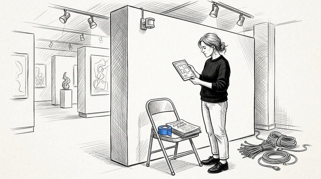 Prototyping and spatial layout creates initial room configurations, positions artworks strategically, and implements basic interactivity. Curators experiment with sightlines, pacing, and information density to optimise flow.